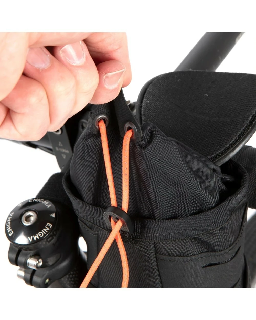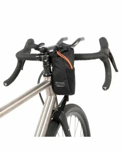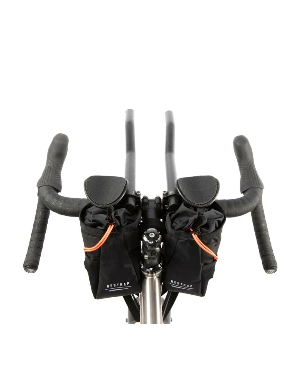 Si la sacoche RESTRAP Race Stem Bag s’utilise en général seule, on peut la doubler – comme sur une des suggestions en photos – pour avoir un maximum de rangement à portée de main. Elle complète parfaitement un équipement de Bikepacking ou d’Ultracycling.