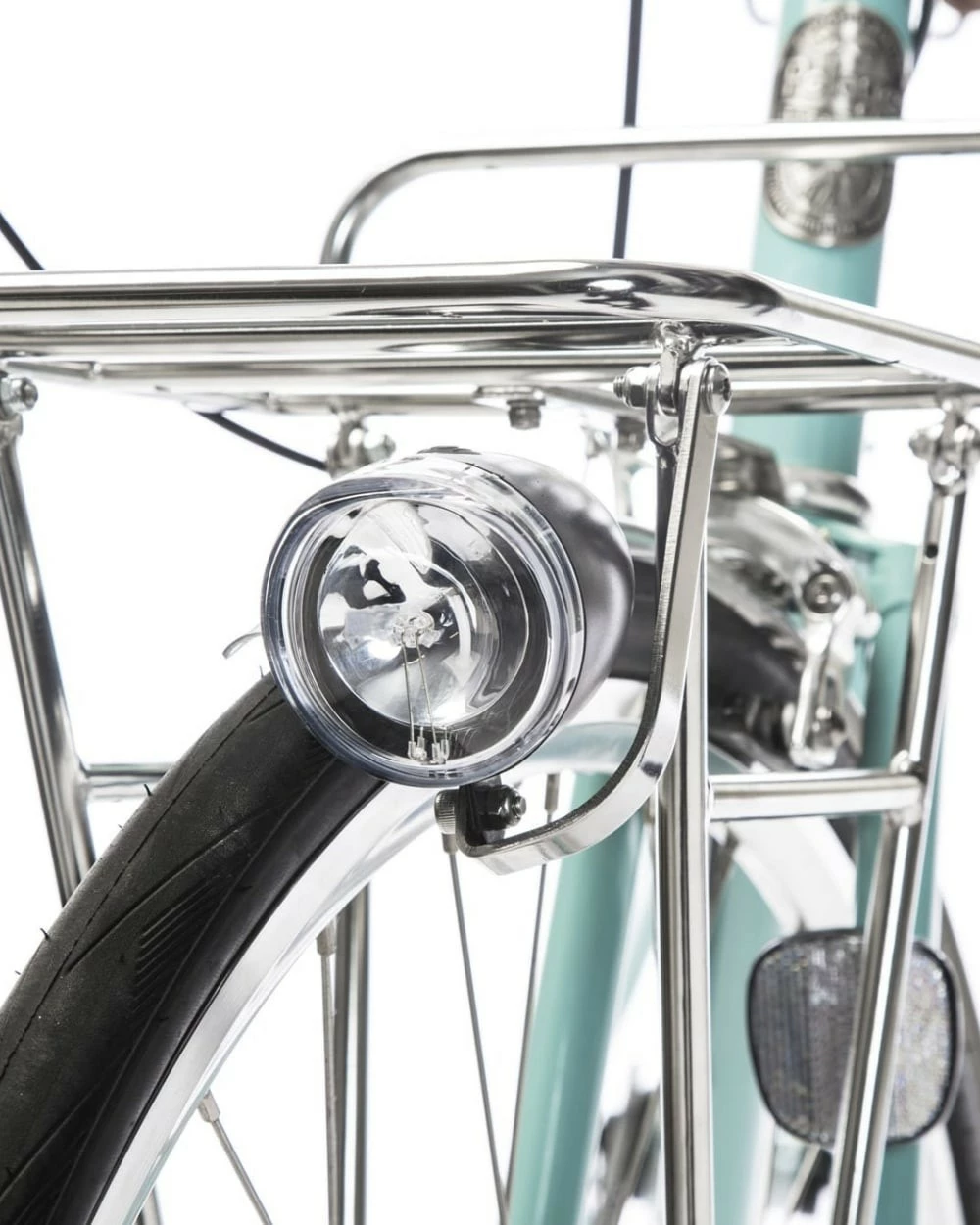 Le porte-paquets propose un astucieux système de fixations sur l’axe de roue qui le rend compatible avec des roues de 26″, 650b ou 700. On aime aussi le détail du support d’éclairage fourni.