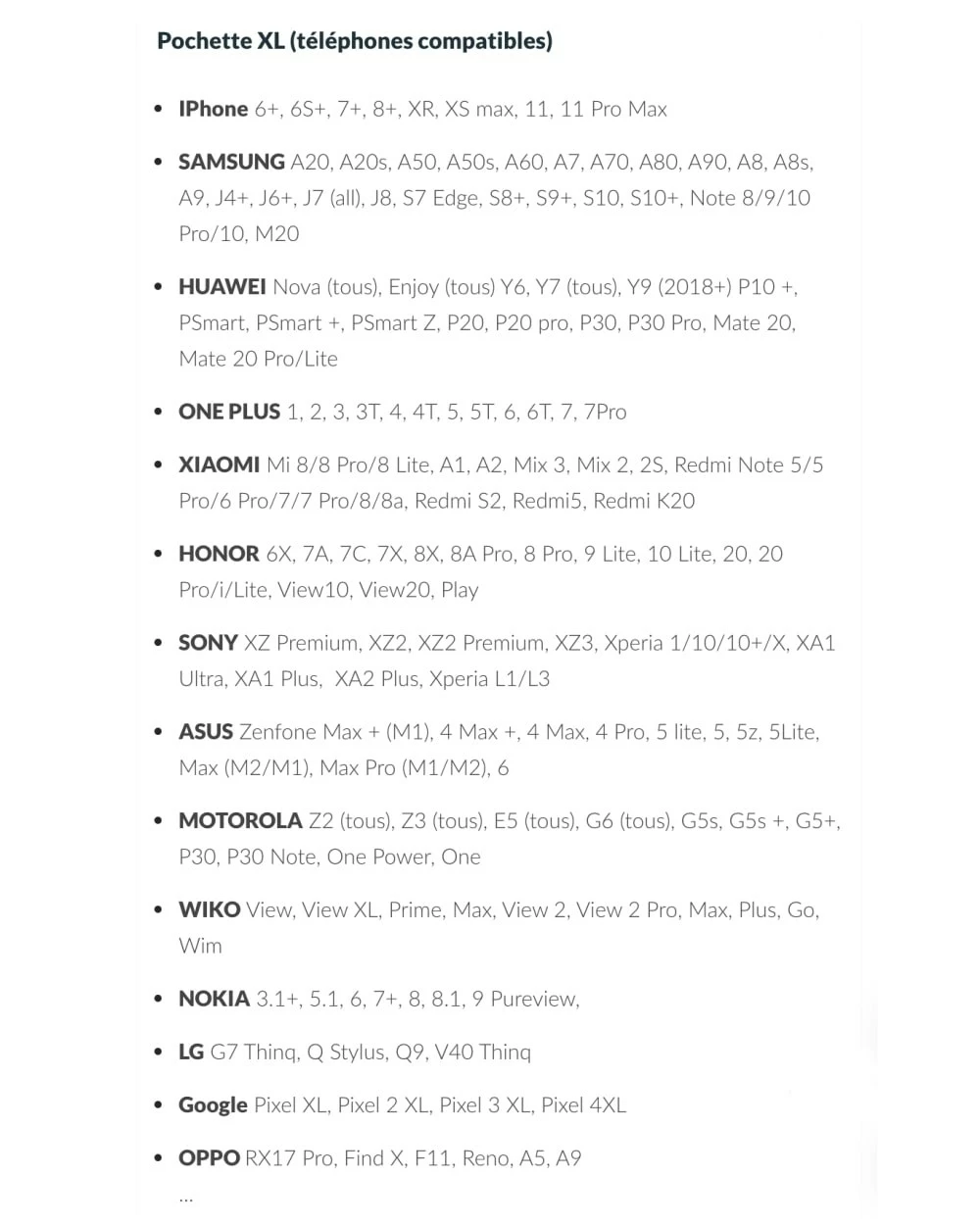 - Dimensions de la version XL : 9,2 x 16,8 cm (pour mobile avec un écran jusqu’à 6,3″ – liste sur les photos)
